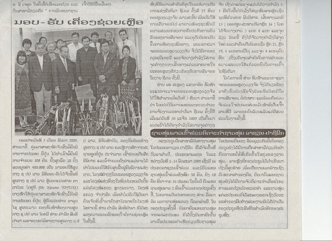 午後はPさんがラオス青年同盟の本部へ案内した。そこで、麻布の大使館でラオス大使への事前説明に同行したBさんと再会し、彼の仕切りで引渡式が行われた。独立記念日の翌日と云う事で、子供たちが式典に参加が出来なかった事は残念だったが、この様子はビエンチャンのマスコミも採り上げ、載った新聞が、後日、送られてきた。式で使われた垂れ幕などはKさんが丁寧に畳んでもらい受け、日本でこの事業に協力したボランティアの方々へのうれしい土産となった。