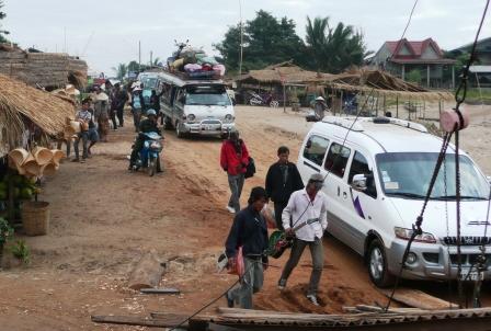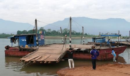 メコンを渡るフェリーは二艘のボートを並べて、どに甲板用の板を渡した簡単な代物で車が7〜8台程で一杯になる。水位が高い雨季には川幅が増えるのか、フェリーの甲板から2〜3メートル四方の板床を更に岸へ渡す。その上をゆっくりと川へ落ちないように車が乗り込む。上陸する時も同じだ。生活物資を運ぶ業者のトラックや、屋上に荷を溢れんばかりに積んだ中型トラックを改造した定期バス、そして観光ミニバスが対岸を目指す。ゴム草履の青年が操舵する。その横に座って観察すれば、心もとないフェリーの作りだ。安全基準などがあるはずがない。自転車やバイクだけを乗せた小さなボートも営業し、川を渡っている。兎にも角にも、このフェリーを使って対岸へ渡る。