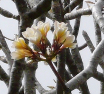 リンガの石柱の並ぶ参道から山の斜面に沿うように宮殿やテラス、歩廊などクメールの寺院遺跡が続く。石段の左右にはラオスの国花のプルメリア(チャンパ、或いは、フランジパーニとも云う)が咲き満ちて強い香りを放っている。