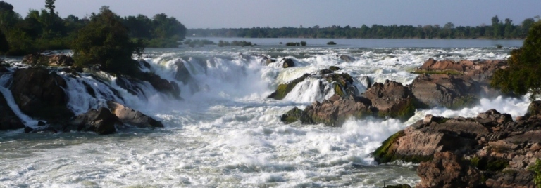 昼食はチャムパーサックのメコン河を望むゲストハウスの食堂で済まし、再び、フェリーでメコンを渡り、国道13号から、4000の島々を意味するシーパンドーンへ行く。その島々を縫うように滝が形成されている。コーンパペンの滝は中でも川幅が300メートルもあり迫力十分だ。タイやマレーシアからの観光客も多いらしく、土産屋や食堂なども充実している。