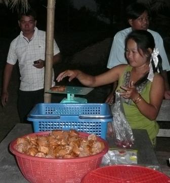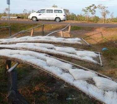 途中の道路脇でビーフン作りを見て、砂糖椰子から砂糖を作る場所に立ち寄って、それぞれプリミティブな製法を見る。砂糖椰子の芽の切口から樹液を一晩かけて溜め、それを煮固めた砂糖は混じりけなしの甘さで色々と料理にも使える。これは普通の土産屋では手に入り難い。