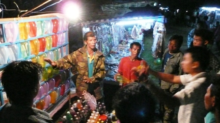 目的のメコン川に沿う町では大きな祭があった。街へは交通遮断されていたが、宿へ行く事で許され、川を一望できる瀟洒なゲストハウスへ到着する。夕食する場所を探しに川べりを歩いたが、道は夜店で埋まり、広場には俄か作りの飲食店や遊び場もある。夜店には射的や串焼肉など食い物屋、玩具や駄菓子屋など、テントの店はどこも混んでいる。大勢の人で大変な賑いだ。今回のラオス旅行で最も活気があったと思う。