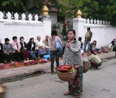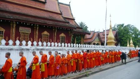 明け方の6時前に托鉢僧を見学するために、通りに出た。人は少ないが、既に歩道には敷物に喜捨するための蒸したうるち米を入れた篭が等間隔に置かれていた。敬虔な信徒が準備をしたのだろう。遠くからトゥクトゥクに乗って来る信徒もいる。6時半前には喜捨する人たちが次第に集まって、歩道に座り始める。 喜捨は女性が多く左肩からタスキを掛けている。喜捨物を売る人も現れ、私もみかんを買った。間もなく、寺から橙色の衣を着た托鉢僧が列を作って現れた。次から次へと百人以上の、少年から老年の僧まで丸い金属の鉢を肩から吊るし長い列を作って進む。喜捨は基本的に座って行う。蒸し米だけでなく、バナナやみかんなど、そして蓮の花を奉げるグループもある。鉢に一杯になった喜捨された物は所々に集められ、纏めて寺へ持ち帰る手順もありそうだ。無口な列は延々10分も続き渡り、その後も別な寺からの僧が時折過ぎて行った。この托鉢風景は毎日欠かさず続いているのだ。