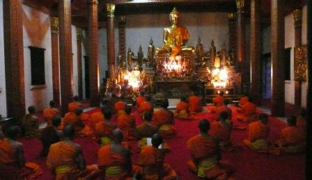 夕暮れの町をレストランへ行く途中、読経の調べに誘われて近所の寺に立ちよれば、夕方の勤行の最中で、堂内に唱和の響きが心地よい。そう云えば、どのラーオ族ガイドも、多かれ少なかれ、どこかの寺院で修業し、朝の托鉢も経験したと話していた。