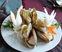 乗船して間もなく昼食となる。このベトナムの料理は貝やエビなどを見栄え良く皿に盛って、味も申し分ない。昼食を終えて、甲板のテーブルでコーヒーやお茶などで寛いだ午後の時間を過ごす。小さな漁船も時折見える。