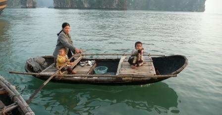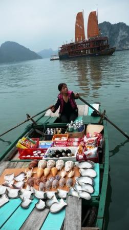 クルーズ船が停まる観光スポットには、貝殻などの土産を乗せた竹の舟が売りに来る。子供も乗せている舟も多い。