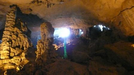 やがて、ある島へ近づきそこから小舟に乗り替えて鍾乳洞へ向かう。島では石段を昇り降りして巨大な洞穴に入れば、そこは見事な鍾乳石や石筍が灯りに照らされている。それぞれの形に猿とか亀とか名前が付けられているのは日本や中国も同じだ。