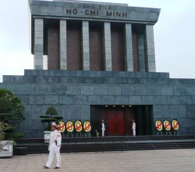 近くのホー・チ・ミン廟へ向かう。閉館で、十二年前と同様に、外から眺めるだけだったが、入口には白い軍服の衛兵が二人立つ。国民はベトナムを解放した偉業に対して強い敬愛の念を抱いき、本人は火葬を希望したが、遺体をこんな形で維持された。「この維持管理で遺体は毎年ロシアへ送られる」とガイドの説明。