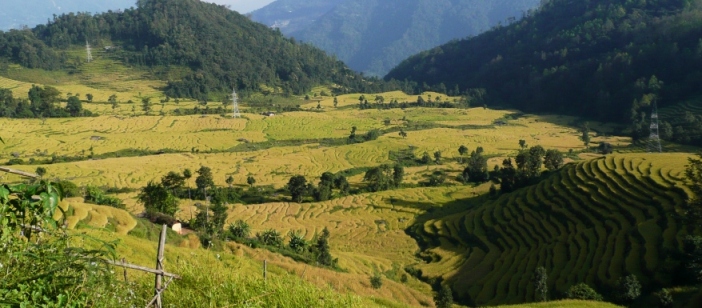 ルムテク僧院からペリンへ向かう途中、素晴しい棚田を歩く時間を持ってくれた。広い平地が取れないヒマラヤは棚田でした稲作は出来ない。等高線の様な曲線に区切られた稔り田の棚が見事に谷へ広がっている。秋の香りが豊かだ。