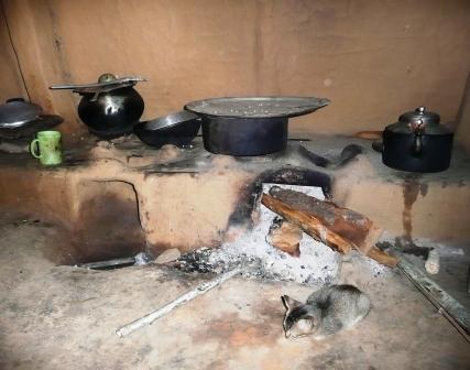 そこから暫らくして、代表的なネパール人の民家を訪問した。道から50メートル程入った土壁、草葺きの小さな民家へ案内してくれた。70年前にネパールより移住して、小さな田と牛、豚、山羊、鶏と一緒にこの家に住んでいる。今は四世代の家族で、その長老と私とは同じ年だった。電気、ガス、水道は無い。豆や米などの穀物の貯蔵も同じ屋根の下で、7人の家族がどうして寝ているのかと思う。土間の台所には高さ30センチほどの低い竈があり、使い込んだ鍋と薬缶が載せてある。穀物を粉にする石臼もあった。重そうだ。長老夫人は古いしきたりの鼻飾りをつけて愛想が良い。若いお嫁さんが子供を抱いて帰ってきた。その子を抱かせてもらって、皆で一緒に写真を撮ったが、オムツなどしていないお尻だった。お礼に50ルピー札を手渡してきた。(帰国後、このプリント写真をこの家族に届けてもらうように、K氏へ郵送した)