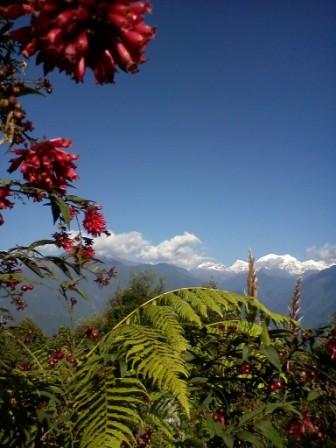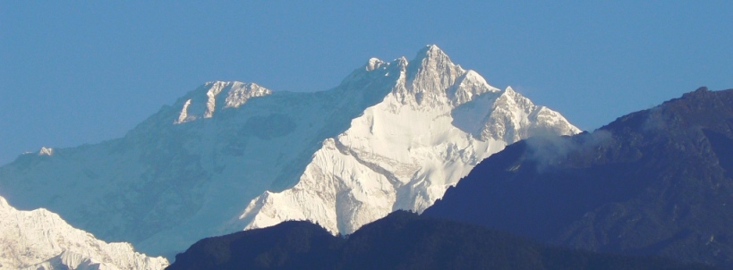 朝6時前、少し寝過ごした。時差が無くなり、現地時間に慣れてきたのかも知れない。薄明かりの窓のカーテンを開けると目の前にヒマラヤの夜明けが始まっていた。中央にカンジチェンジュンガを金色に朝の曙光が反射している。可なり近くに見える。急いで、着替えてホテルの庭に出て、明けゆくヒマラヤ山塊を眺めた。晴れあがった空へ、白き名峰は神々しさすら感じられる。