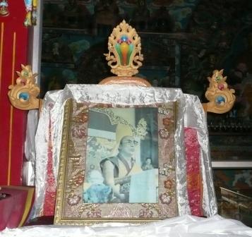 勤行の行われる最も高い戒壇には額入りのダライ・ラマ14世の写真が置かれる。活仏写真だ。K氏の話では、前世の地位によって、転生化身の戒壇の高さが異なり、ダライ・ラマはその頂点に位置するとの事。