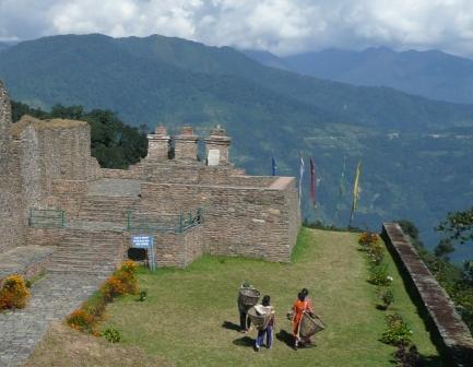 ペマヤンツェ僧院から眼下に見えるラブデンツエ(1670年から1814年までのシッキム王国の旧都)へ移動する。1キロ程の遊歩道が出来て、森林浴をしながら遺跡までの小径を歩く。ここには王宮や寺院の礎石が残るだけだが、観光整備を進めている。篭を担いだ女性たちが、草花を植えて王宮跡を公園化していた。ここでは陽気なマレーシアからの観光客と会った。