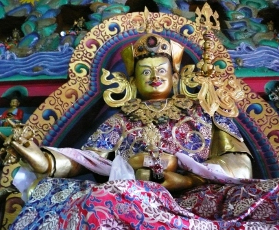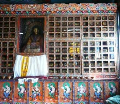 この寺院は1976年にダライ・ラマも訪れて、戒壇には彼の写真が置かれている。本堂の壁には108の経典が納められている棚が設えてある。寺院のまわりのマニ車の回転を良くするために老人が油を差しながらチェックして、その後を老婆が確かめるように回しながら時計回りに寺院を一回りして堂内へ入った。