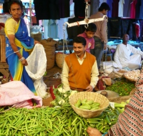 インドは農作物の種類と収穫量の多さでは世界有数な国だが、このカリンポンでも色々と珍しい野菜が売られている。例えば、野菜烏瓜、丸い唐辛子だ。魚は少なく2店だけで、バングラデッシュからこの日の為に運ばれた、鱸のような魚があったが、種類は少ない。鶏や山羊などは生きたまま売られる。金物屋には鍬や鎌、それに、ネズミ捕りなどいずれも生活必需品なのだ。