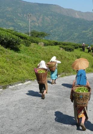 カリンポンの観光を終えて、ダージリンへ向かう。尾根から尾根へ山並みにそって進む曲がりくねった道には茶畑が次々と出現する。丁度、秋の茶摘みが始まったとか、近隣の村から集まった女性達が朝から夕方までの8時間を茶摘みに費やす。傾斜地のダージリン茶畑は谷底まで続き、また、山を越えてもまた茶畑が続く。