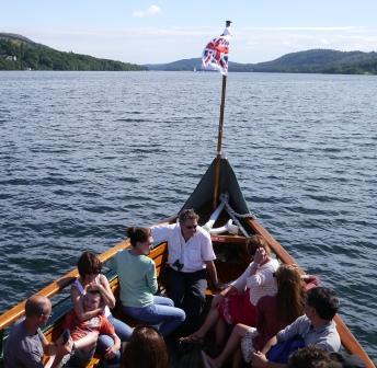 次に、湖水地方で最大の湖、ウィンダミア湖の観光船遊覧。幸いに天気は上々だ。200人で満員の船が南北に細長い湖を9キロ程南下する。屋根はあるが仕切りや窓もなく風が実に心地よい。乗客は夏休みを利用しての海外からの観光客が多いようだ。湖でヨットを楽しむ人も多い。東西の幅は狭いので、左右にはゆったりとした北国の夏景色が眺められる。