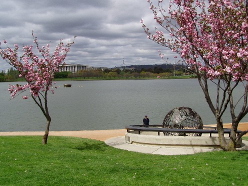 三日目は600キロのドライブなので、朝9時に出発。それでも、首都キャンベラを見たいこともあって、一望できる八重桜が満開のレガッタポイントへ。目の前にはこの首都の設計者の名をとった、Burley Griffin湖があり、高い噴水が噴きあがっている。(説明書によれば、147m)その先には、傘の骨のような異型な国会議事堂があり、それを中心に放射状に道路が展開している。街としての建物は非常に少ない。