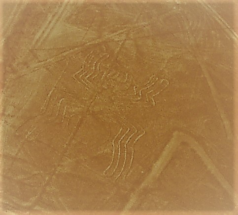 ナスカの地上絵をセスナ機に乗って見る。我々は5人乗りの単発機である。アスパラガスの畑を過ぎれば、荒涼たる砂漠である。その中をアメリカンハイウェーが一本細く見える。やがて、宇宙士と言われる地上絵を最初に、次々と写真などで見た、犬や猿や鳥などのデザインが見えてくる。これらは地上では絵とは判別することは出来ない。