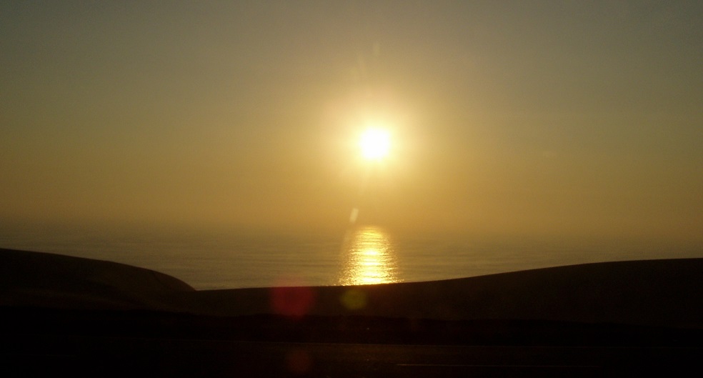 太平洋に落ちる夕焼けは茫々としていた。砂漠がそのまま海へ落ちている情景が何時間も続いた。「あの先は日本の朝ですよ」と話す二世のオオイシ氏が印象的であった。