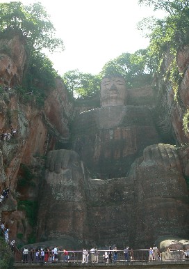 楽山大仏は高さ71mの世界最大の石刻坐像で、岷江を望む姿で赤い地肌の凌雲山に彫られている。この地で多かった水難と水害を鎮めるために、凌雲寺の海通和尚が、唐の玄宗皇帝の時代に、寄付を募り造り始めた。90年の歳月を要したらしい。