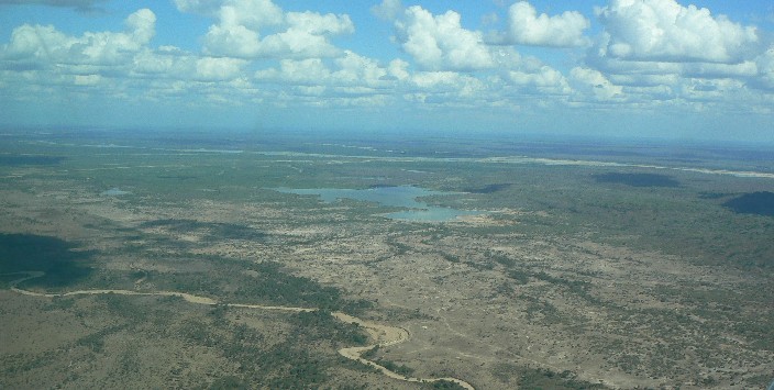 80分のフライトの眼下には、乾いた赤土から湖沼や緑が目に入ってくる。