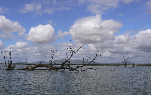 翌朝は先ずボート・サファリを選ぶ。6人が小さな舟に乗って、湖を2時間ほど遊覧する。小さなエンジンで船頭ひとり。昔より水位が上がって多くの木々が湖の中で枯れて、それが、オブジェのように見える。伐って飾りや家具としてヨーロッパへ運ぶ過去もあったらしいが、今は禁止されている。