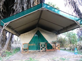マンゼ湖の水辺は近くなのだが、マサイのエスコート無しで、道を外さないことと注意をされる。確かに象が頻繁に現われたし、蛇や鰐も出没するらしい。個々の宿泊テントにトイレとシャワーは付属してあるが、電気は無い。トイレの屋根は半分しかないので見事な夜空を見ることが出来る。灯りはローソク2本と灯油ランプ、それに懐中電灯だけ。中央のテントは時間制限の自家発電で、電池などの充電はその時間内に行う。ルアハより更に野生に近づいた雰囲気がする。