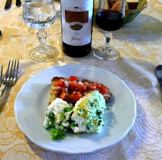 <昼食の前菜はリコッタ・チーズとトマトを載せたパン>