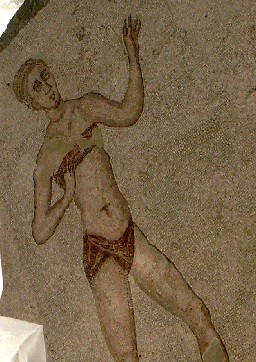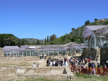 丁度、修復中の為に、多くのモザイク部分がシートで覆われて、入場料金は半額の3ユーロだった。それでも隙間から美しいモザイクが見えるようにもしてあり、観光客の入場を許されていた。そこには当時の生活、戦、狩や漁、神話などが26の部屋の床に色も鮮やかに描かれている。中でも「10人の少女の部屋」には、ビキニ姿の女性達の遊戯が今のフィットネッスの様な闊達さで描かれている。作業の埃で白けているが、その一部が修復シートの破れ目から覗けた。磨き上げた床は、買った本で楽しむ事にする。それでも幾つかのテラスのモザイクを歩き見て、また、踏んだ。