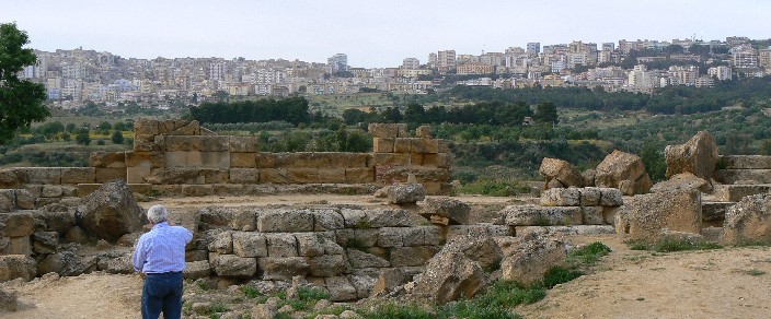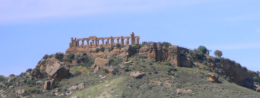221年前の4月23日にゲーテはこの地に入って五泊した。当時、この町はシチリア語のジルジェンティとなっていた。イタリア語ではアグリジェント。「今朝の日の出に見たような美しい春の眺めは生まれて以来未だかって出会ったことがない。(略)宿の窓からはかって栄えた町の遠く広いなだらかな傾斜がみえ、それが農園と葡萄畑ですっかり蔽われて、その緑の下にむかし人口稠密だった市区の痕跡があろうとは思われないほどである。ただこの緑濃く、花咲き匂う平原の南端にあたってコンコルディアの神殿が聳え、その東にはジュノー神殿の若干の廃址が見えるのみである。」と感激している。この文章では、写真のジュノー神殿は廃址として記され、現在のように立っていない。