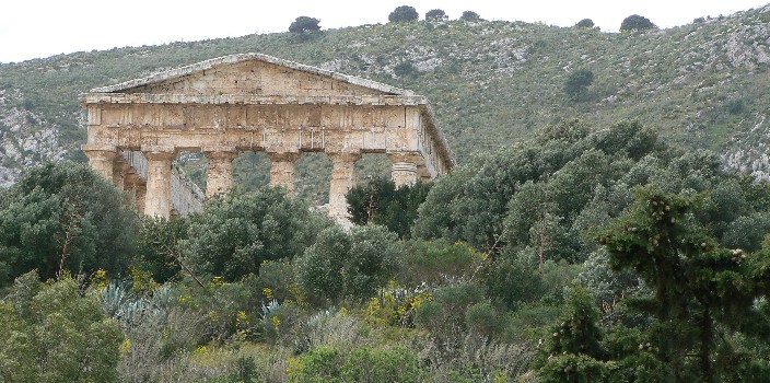 次に、セリヌンテと戦を続けたセジェスタへ行く。竜舌蘭と茴香(ういきょう)の花が咲く辺鄙な丘にひとつだけ建っている、ここセジェスタの神殿は建造された紀元前5世紀の姿を最も良い形で保存されている。同時に構造上に祭壇が無いことから謎の神殿とされている。