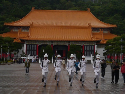 食後は台北市内観光。次に訪ねた蒋介石総統を祀る中正記念堂では衛兵交替が正に始まる直前だった。中正紀念堂は、中華民国の初代総統である蒋介石の活躍を讃える為に建てられた記念施設であり、台北101、故宮博物院と並ぶ台北の三大観光名所である。