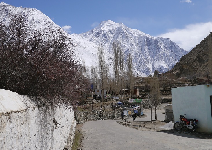 雲が流れて青空がところどころに見え始めた。ヒマラヤの山々とフンザの郷を眺めるべく、早速に宿の屋上に出る。雲が標高7000m級の峰に引っかかっているが、天心は抜けるように晴れた。これらの峰々の囲むフンザの郷の中心地カリマバードに目を向ければ、傾斜面の山麓の家々には、杏の花が満開で、併せて、芽吹きポプラがすばらしい春の景色を作り上げている。