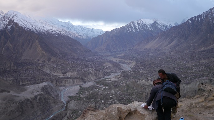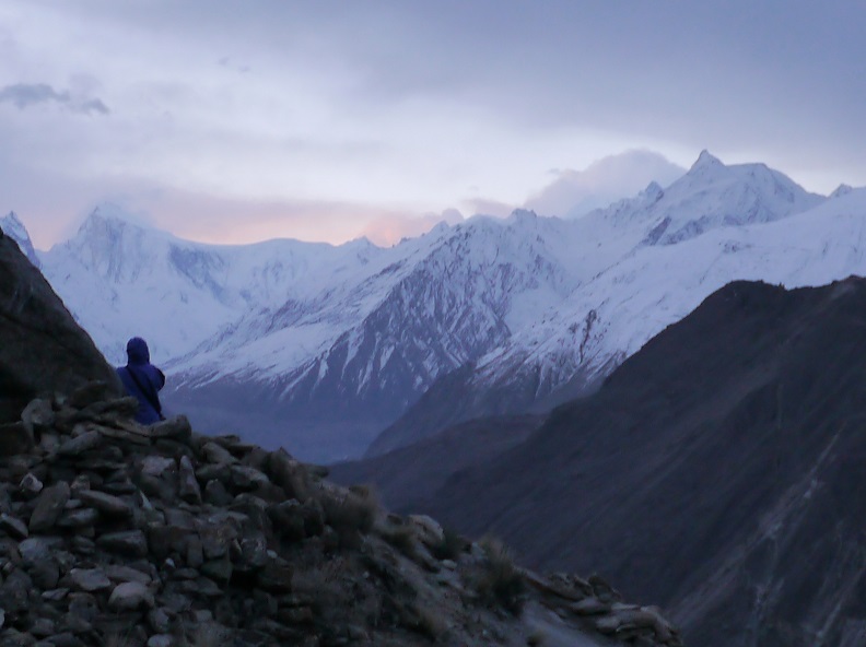 暁闇から次第に明らむ峰々、ラカボシ(7788m)、スパンティーク(7027m)、ディラン(7253m)、そして、後ろには一本立ちのレディフィンガー(5965m)が展望できた。眼下には一昨日と昨日たずねたフンザの村々が一望できる。太陽の出る山に少し雲があったので、日の出の鋭さは欠けたが、ドラバー達が用意してくれたチャイで温まりながら、楽しい時間を過ごせた。