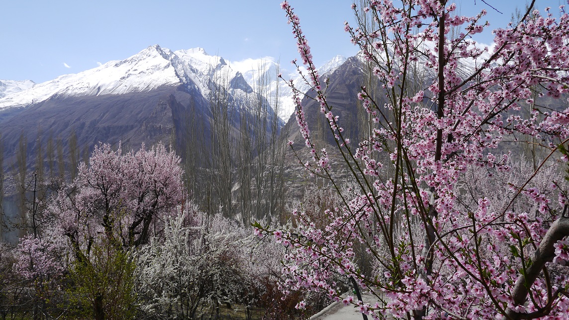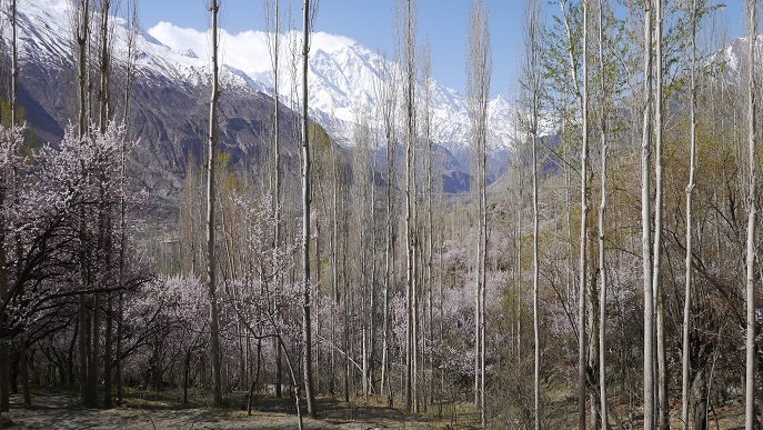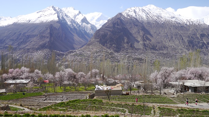 宿に戻って朝食すませ、三連泊も終わったので、屋上で改めて四囲の山々を眺め尽す。旅鞄を部屋の外に出して、杏や桑の木々が植えられている村の水路を散策した。冠雪のカラコルム・ヒマラヤ連峰と澄み切った青空、真直ぐに伸びるポプラの木と杏の花がとても美しい。小さな畑では草の緑が色を添える。たまに行き交う地元の人達は穏やかで、とても平和な気分にさせらる。桃源郷と云われる意味が良く分かる。
