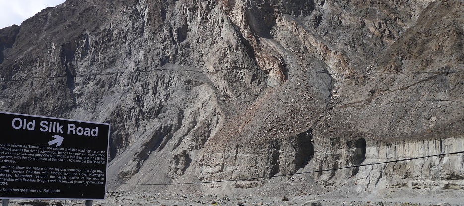 更に南下して、かつてのシルクロードが川の対岸をジグザグとはっきり見える場所で写真撮影のために停車。その昔はここでインダスの支流、フンザ川を渡ったと云う。ロバがやっと通れる幅を1958-60年にかけてジープが通れる様に拡幅されたが、70年代のKKH(カラコルム・ハイウェイ)がつくられてからは使われなくなった。しかしながら、「ラカポシ峰(7788m)を望む素晴らしい景観と、この歴史を残そうと、アガカーン文化サービス、ノルウェー大使館、そして、ナガールとフンザの人達の協力のもと、2004年にこの旧シルクロードは遺跡として修復された」と表示板が立っている。