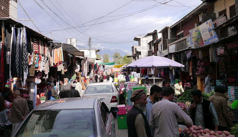 町は男ばかりで、フンザ地域とは違う。イスラムでも原理主義の影響が強いのだろうか?バザールの路地には野菜や果物をリヤカーに山と積んで売られている。鶏肉の店前には、生きた鶏と、殺したばかりの鶏を吊るして売っている。店の中では毛をむしっている。肉は新鮮なものしか許されないのだ。山羊や羊や牛は生きたまま、少し離れた場所で売られている。勿論、豚はいない。売られている種袋は殆どが中国からのもので、茄子、オクラ、カブ、トマト、キュウリなどで、この町の食材が窺える。丁度、祈りを終えてモスクから出てくる人たちと交錯しながら、駐車違反を避けてぐるぐると町を廻って来たマイクロバスが一瞬の停車で、全員急いで乗り込んで、バザールを去った。