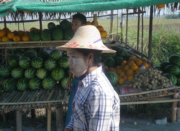 昨日のトラックで山を下り、専用バスでヤンゴンに戻る。途中の道路脇には西瓜やザボン、水代わりに食べる芋などを売る屋台が多く出ている。その内のザボン果樹園に立ち寄り採れたばかり実を食べた。ここは政府の直営店で、季節を通じて、果物を直売している。今回の旅では、このザボンと西瓜が一番に美味しかった。