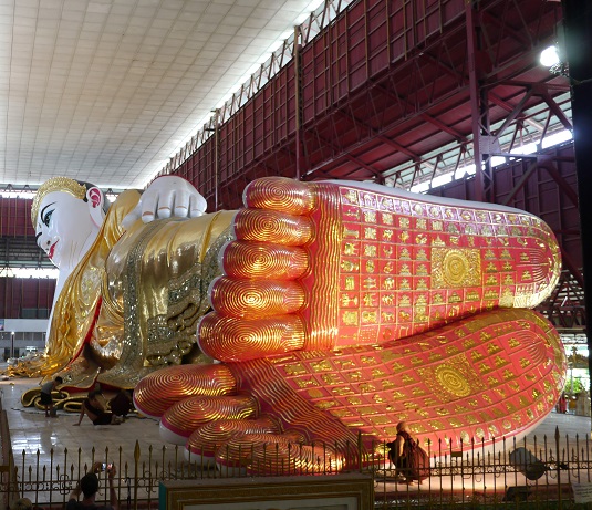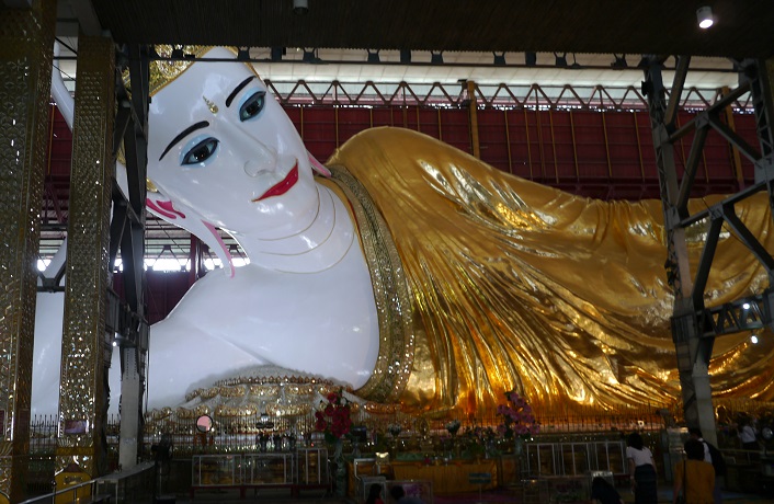 次に巨大な寝仏で名高いチャウッタージー・パヤーへ行く。大きな屋根の下に全長65mの寝仏が祀られている。1907年に完成したが、数十年のうちに状態が悪化したために、1966年に信者たちが修復をして、その時に5mを加え、その修復は信者の寄付で賄われた。