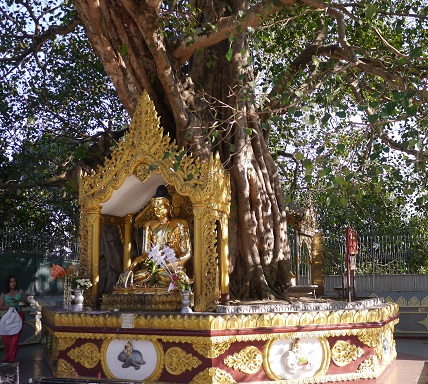前回来た時には歩いて登ったが、今回は他の外国人観光客と同様に、南参道口からエレベータで一気に登り、境内に出た。目の前に聳える金の仏塔の上半分は修復のためにカバーが掛けられているのが残念だ。433mの基底部の周囲をゆっくりと半時計方向に回って、自分の誕生曜日の仏に水を掛けて願をかける。ミャンマーの伝統暦は八曜日で、通常の曜日に水曜日は午前と午後がある。私の誕生曜日は日曜で、方位は北東、支配星は太陽、象徴となる動物はトリ(ガルーダ)となる。