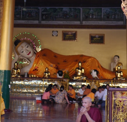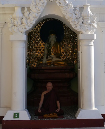 多くの善男善女が大理石の敷き詰められた広場で座って祈りを捧げている。60余の塔はお堂にもなって、釈迦像が祀られている。それぞれ信者が集まり手を合わす。あるお堂では僧侶が周囲の雑音にも惑される事もなく瞑想している。ボランティア活動なのか、箒を手にした団体が一斉に列をなして掃除をしている。市民の憩いの場、ミャンマーを代表する観光の場をそうして守っているという。