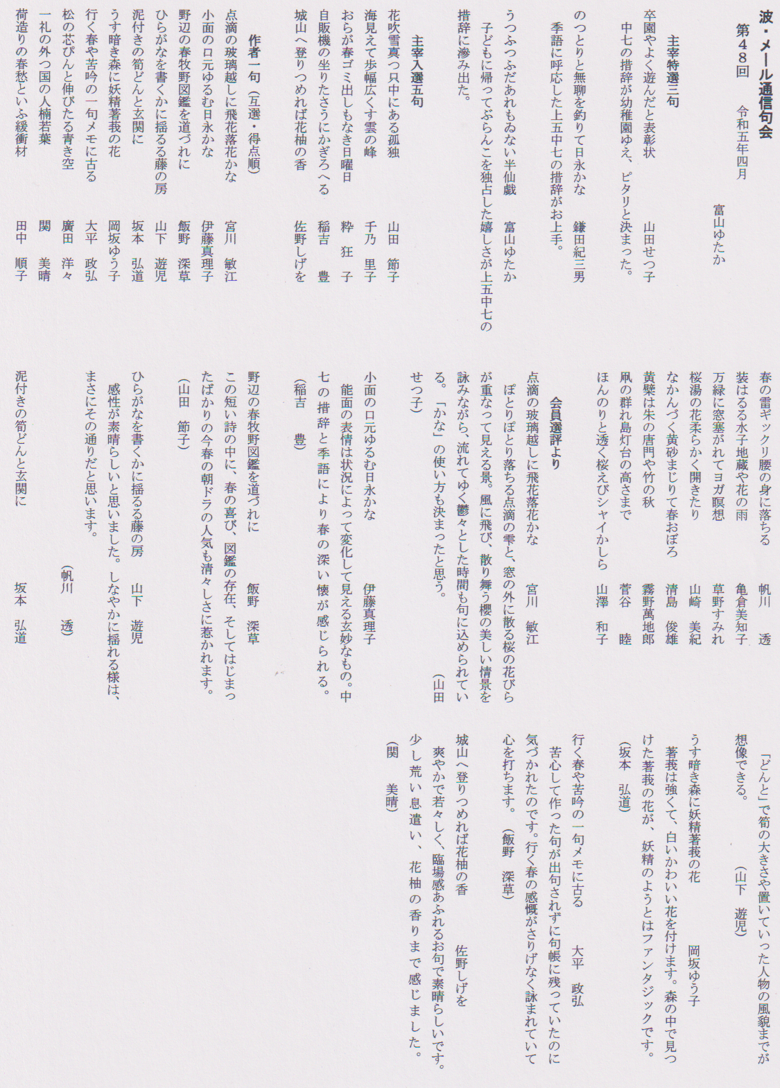 日輪のかけらこぼれて初蝶来 工藤加代子 春愁や頁をめくる音のあと 小鳥遊 彬