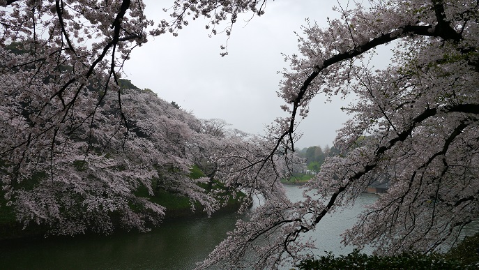 頭上より眼下の濠へ花の枝