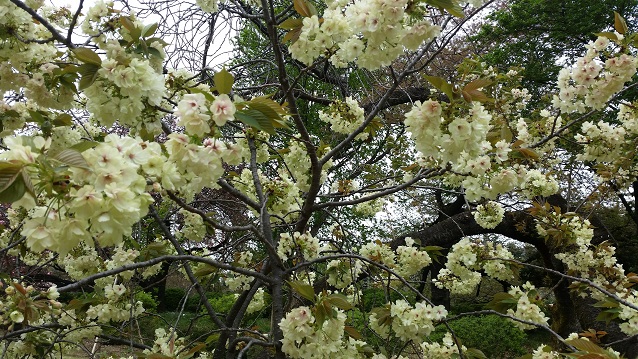新宿御苑の八重桜・関山(カンザン↑と鬱金(ウコン)↓