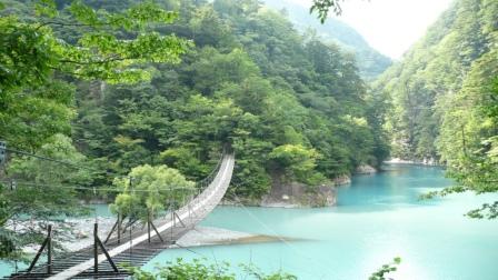 <チンダル湖に架かる寸又峡の吊り橋と見事な杉と檜の林>