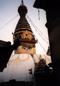 写真:遊覧飛行からのエベレストと郊外の段々畑(上)カトマンズ市内の目玉寺と王宮近くの阿修羅(下)