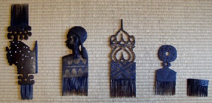 アフロヘアーは世界的に、かなり流行してきたが、女性たちは縮毛を整える技は、さらさらした毛髪を持つ他民族の女性からは想像しがたい手間がかかる。5ミリ位に丸まってしまう毛を伸ばしたり、それを畝の様に纏めたりして飾っている。束ねて紐で括って綺麗に整った女性の頭を見ると、随分と時間を掛けたのではないかと思う。小さな部落のマンゴの木の下で、姉妹がお互いの整髪をしているのは微笑ましい。使う櫛はやがてデザイン化されて飾り物にもなって売られていた。